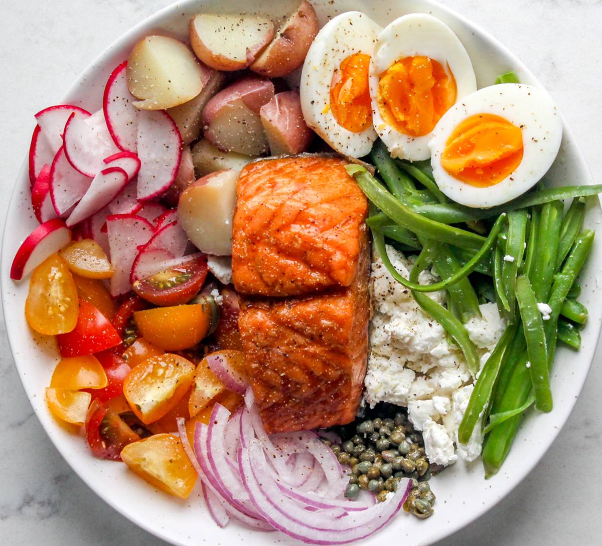 This fall-inspired take on the classic Niçoise salad by @bon_abbetit swaps the traditional tuna for tender, smokey, subtly sweet Maple Smoked Salmon, pairing this luscious, smoky fish with crisp seasonal vegetables and a tangy maple-balsamic dressing. With its mix of textures and vibrant colors (think baby potatoes, haricot verts, radishes, tomatoes, capers, and red onion) this salad is hearty, balanced, and full of flavor.